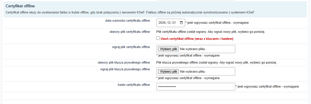 2. Obecny plik certyfikatu offline – opcja uruchamia się, jeśli jest już wgrana para. Przed wgraniem nowej pary skorzystać z opcji „Usuń certyfikat offline” i zapisać zmianę.