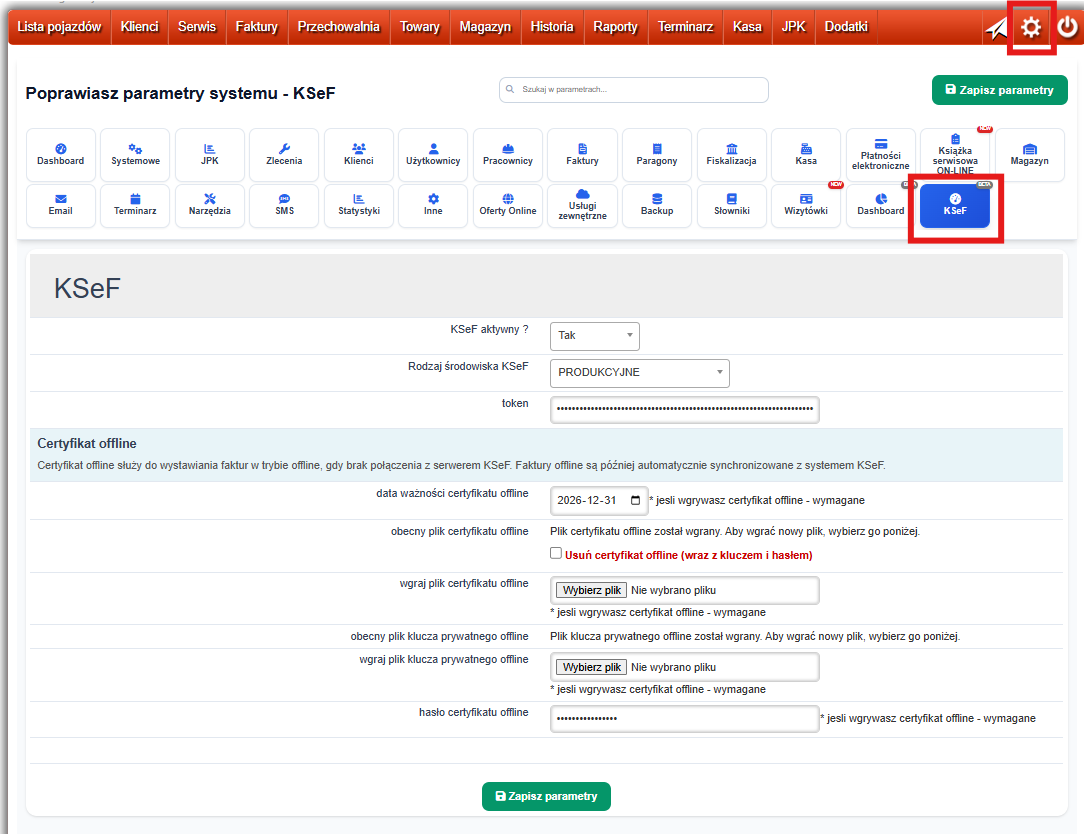 W programie Warsztat24.com przechodzimy kolejno menu-> ustawienia -> KSeF